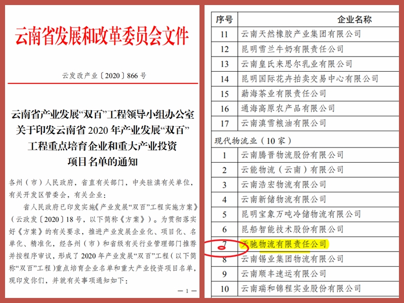 8月25日,公司所屬天馳物流應(yīng)邀參加云南省人民政府新聞辦公室在昆明海埂會(huì)堂舉辦的“云南省加快構(gòu)建現(xiàn)代化產(chǎn)業(yè)體系新聞發(fā)布會(huì)·現(xiàn)代物流業(yè)專題發(fā)布會(huì)”,作為云南省重點(diǎn)物流企業(yè),天馳物流成功入圍云南省2020 年產(chǎn)業(yè)發(fā)展“雙百”工程重點(diǎn)培育企業(yè)和重大產(chǎn)業(yè)投資項(xiàng)目名單。