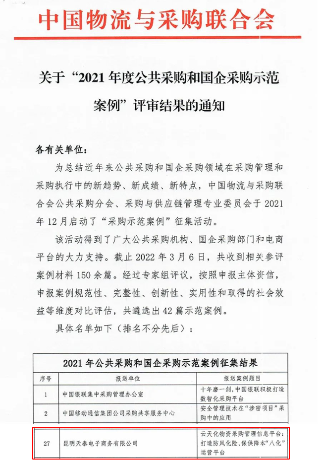 2022年3月31日,中國物流與采購聯(lián)合會(huì)發(fā)布2021年度公共采購和國企采購示范案例評審結(jié)果,公司旗下昆明天泰電子商務(wù)有限公司“云天化物資采購管理信息平臺”申報(bào)案例在全國150余項(xiàng)案例成功入選,為云南省唯一入選案例。