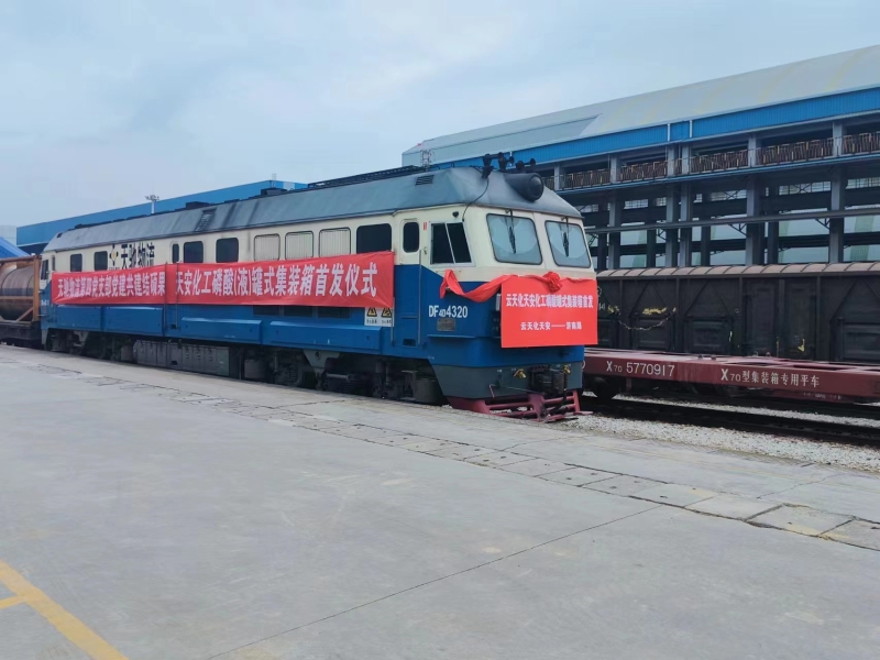 9月1日上午,云天化在安寧物流園舉行磷酸(液)罐式集裝箱首發(fā)儀式。隨著首發(fā)列車在長鳴汽笛聲中緩慢駛出,標(biāo)志著云天化磷酸鐵路專用線正式投用,成功開拓了云天化磷酸運(yùn)輸新模式,推動(dòng)磷酸銷售市場躍上新臺(tái)階。